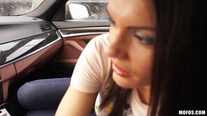 Lusty brunette Kitty Bella with big natural tits is sucking a rock hard cock free of charge and getting fucked in return
